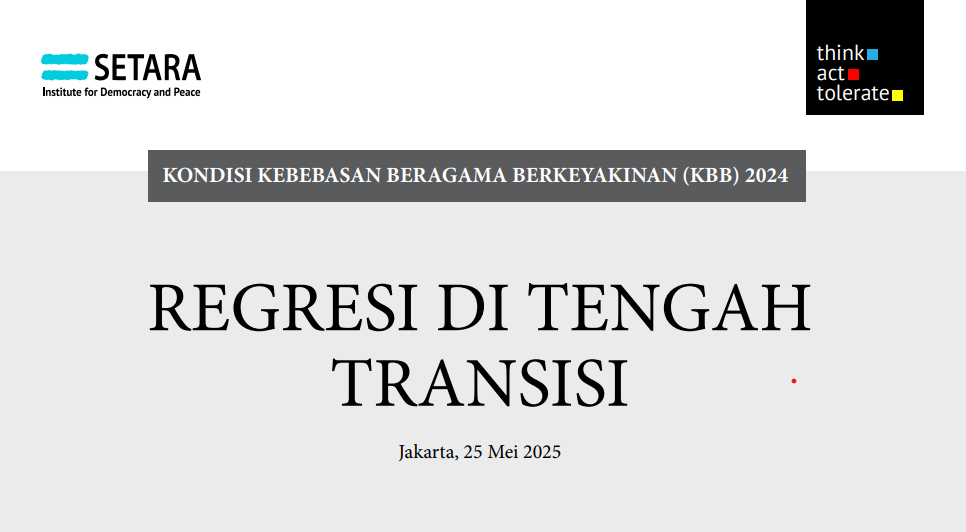 SETARA Institute merilis laporan tahunan kondisi kebebasan beragama dan berkeyakinan (KBB) 2024 dengan temuan mencemaskan: terjadi regresi serius di penghujung pemerintahan Presiden Joko Widodo dan awal kepemimpinan Presiden Prabowo Subianto. Sepanjang tahun, tercatat 260 peristiwa dan 402 tindakan pelanggaran KBB—naik signifikan dari tahun sebelumnya. Tindakan pelanggaran didominasi oleh aktor non-negara seperti ormas keagamaan dan kelompok warga, sementara dari pihak negara, pemerintah daerah dan kepolisian mencatat angka tertinggi. SETARA menyoroti tiga isu utama: lonjakan tindakan intoleransi dan diskriminasi, meningkatnya penggunaan pasal penodaan agama, serta berlanjutnya gangguan terhadap pendirian dan operasional tempat ibadah, meski jumlahnya sedikit menurun dibanding 2023. Fenomena ini diperburuk oleh kurangnya perhatian pemerintah terhadap isu KBB di tengah transisi kekuasaan, serta masih kuatnya pengaruh politik identitas berbasis agama di sejumlah daerah.