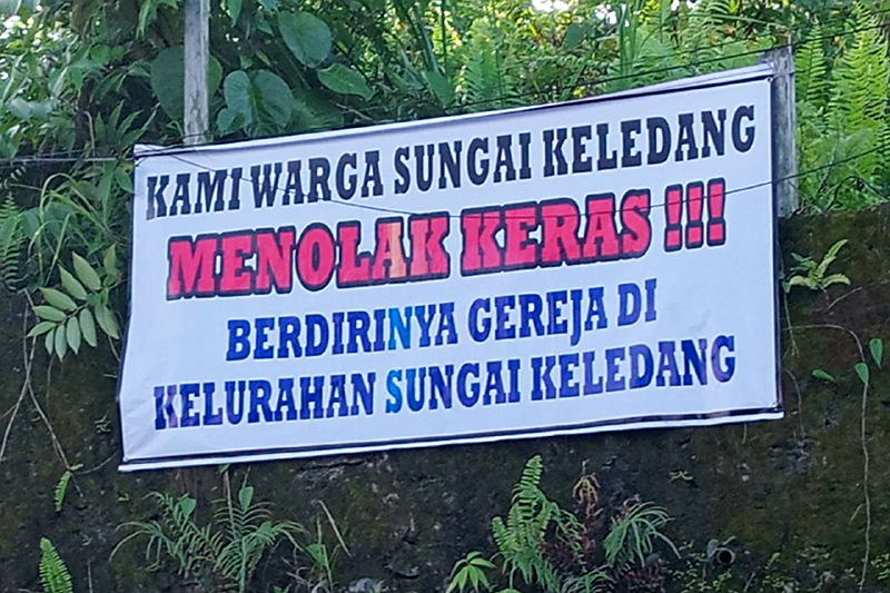 Namun Ahad itu, mereka dikejutkan keberadaan beberapa spanduk yang muncul di pagi buta. Spanduk bertulis, “Kami Warga Sungai Keledang Menolak Keras Berdirinya Gereja di Sungai Keledang”, menebar intimidasi. Salah satu spanduk bahkan dipasang berdekatan dengan rumah Meliasni Panggalo, pendeta yang merupakan ketua Majelis Gereja Toraja Sungai Keledang.