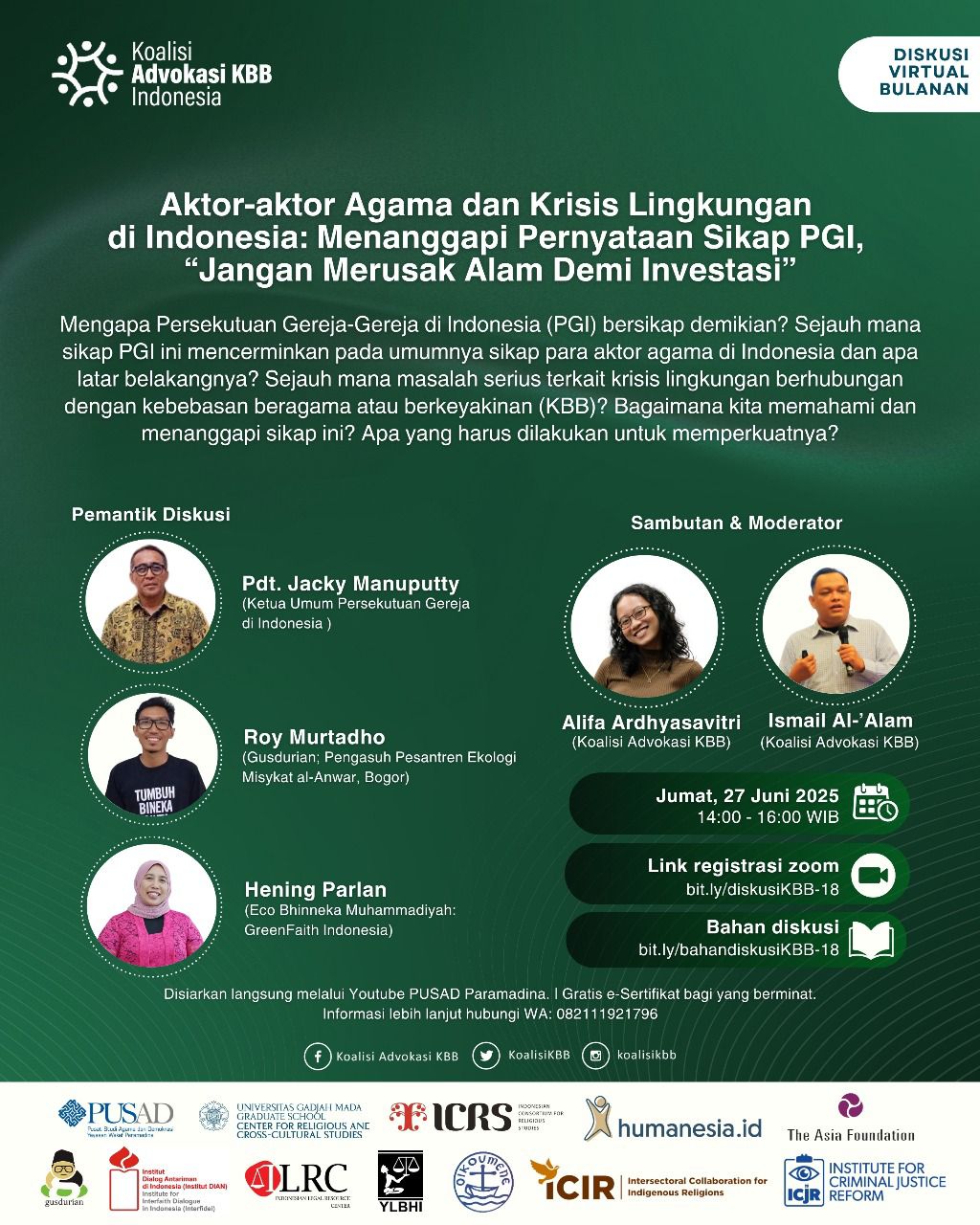 Narasumber: Pdt. Jacky Manuputty (Ketua Umum PGI); Roy Murtadho (Gusdurian; Pengasuh Pesantren Ekologi Misykat al-Anwar, Bogor); Hening Parlan (Eco Bhinneka Muhammadiyah; GreenFaith Indonesia); Alifa Ardhyasavitri (Sambutan, Sekber Koalisi Advokasi KBB); dan Ismail Al-‘Alam (Moderator, Sekber Koalisi Advokasi KBB)