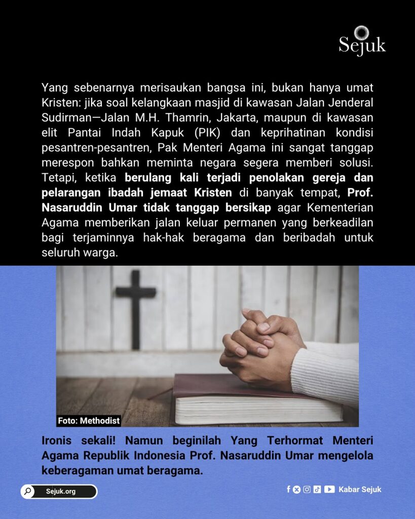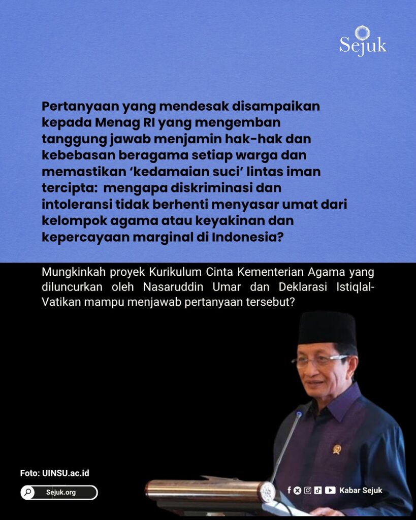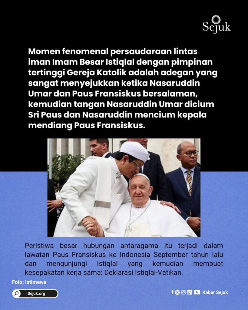 Dua kali tontonan persaudaraan yang tulus antara Pak Nasaruddin Umar dengan dua pimpinan tertinggi Gereja Katolik, tetapi mengapa banyak umat Kristen di Indonesia dibiarkan menjerit tidak merdeka karena tak bisa mendapatkan pelukan dan ciuman mendamaikan dari negaranya?