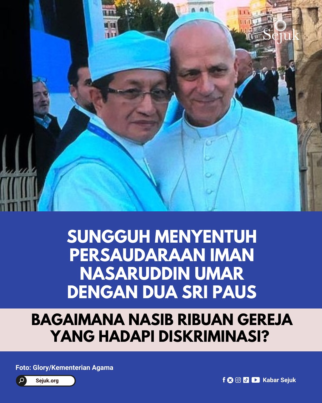 Dua kali tontonan persaudaraan yang tulus antara Pak Nasaruddin Umar dengan dua pimpinan tertinggi Gereja Katolik, tetapi mengapa banyak umat Kristen di Indonesia dibiarkan menjerit tidak merdeka karena tak bisa mendapatkan pelukan dan ciuman mendamaikan dari negaranya?
