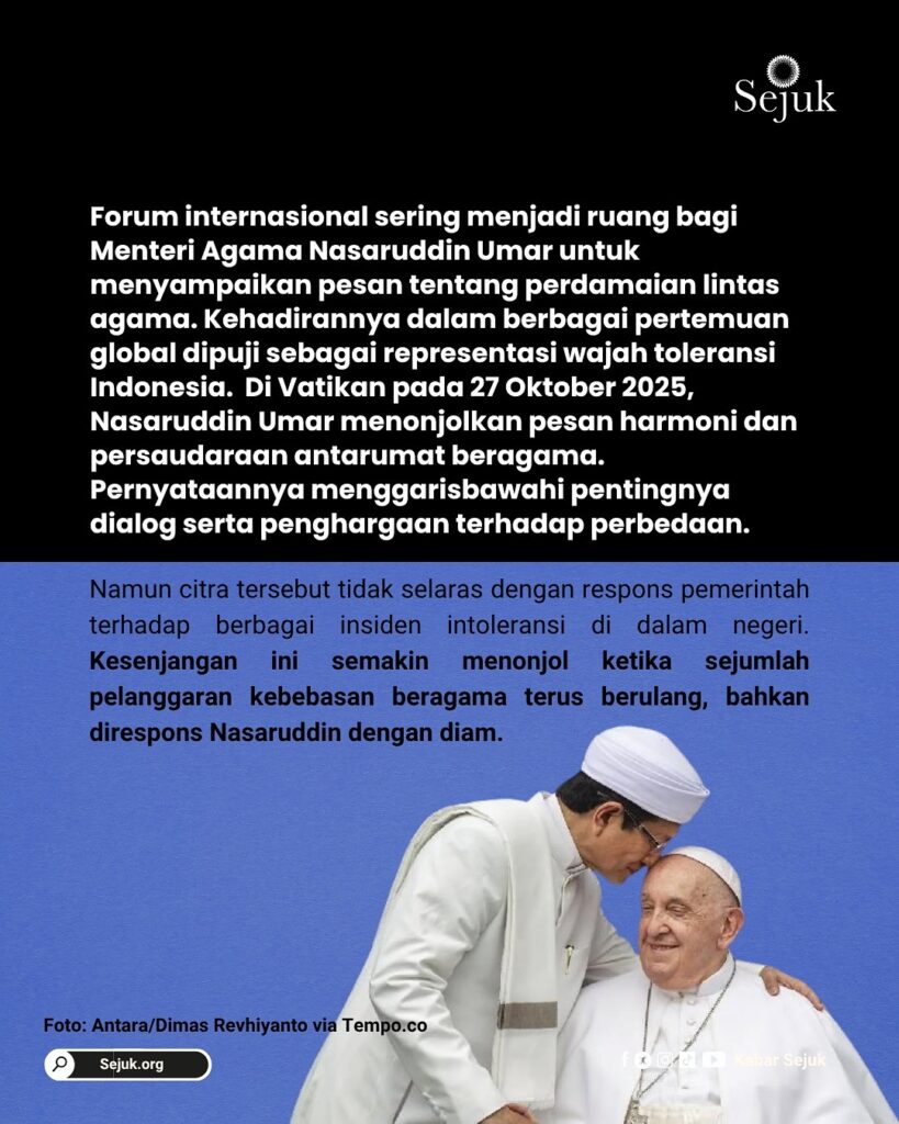 ● Menteri Agama aktif promosikan toleransi di forum internasional, tetapi abai terhadap intoleransi di dalam negeri.
