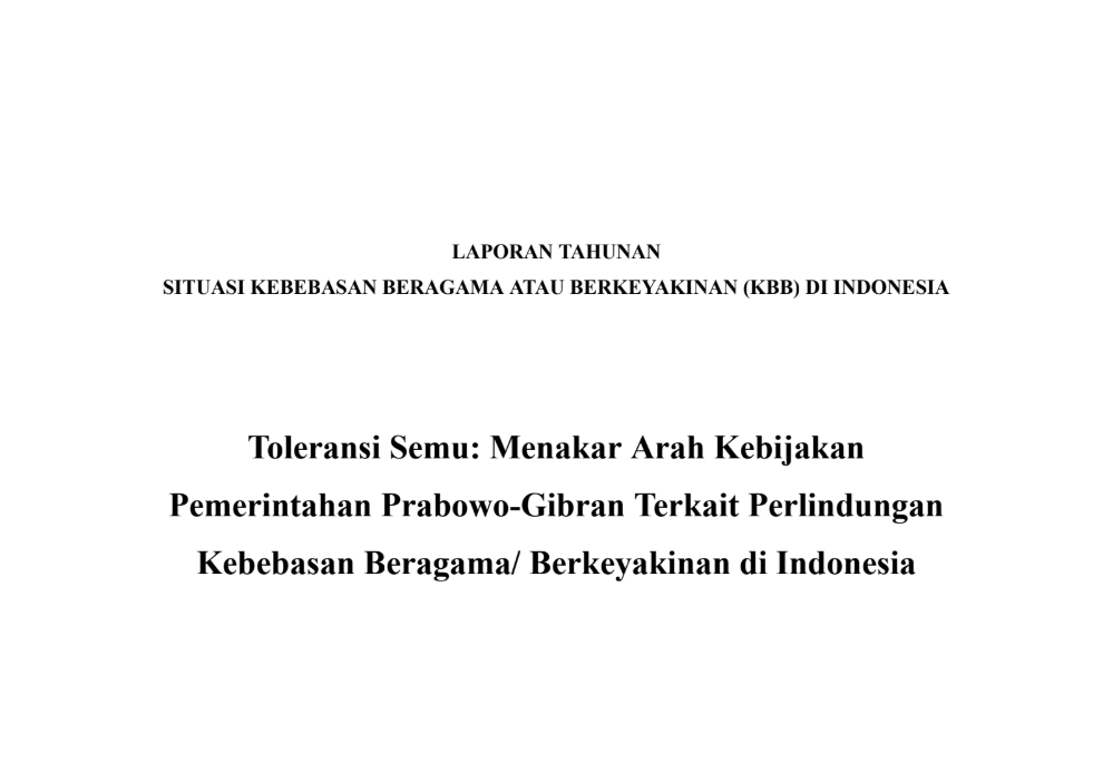 Sudah lebih dari satu tahun sejak Prabowo Subianto dan Gibran Rakabuming Raka dilantik sebagai Presiden dan Wakil Presiden Republik Indonesia pada 20 Oktober 2024. Periode satu tahun ini merupakan waktu yang cukup untuk melihat arah prioritas pemerintahan, sekaligus membaca pola pengelolaan kebijakan yang akan menentukan perjalanan pemerintahan pada tahun-tahun berikutnya. Berdasarkan evaluasi terhadap kebijakan dan langkah pemerintah sepanjang tahun pertama ini, kami menilai bahwa tidak terdapat tanda-tanda perbaikan yang signifikan dalam kehidupan toleransi di Indonesia. Yang tampak justru adalah hadirnya bentuk toleransi semu, yakni suatu keadaan yang mungkin terlihat tertib di permukaan, tetapi tidak disertai dengan penghormatan yang substantif terhadap perbedaan, maupun jaminan kebebasan warga negara untuk menjalankan agama atau kepercayaannya secara penuh.