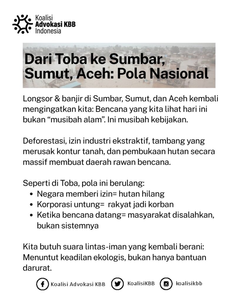 Hari ini Sumbar, Sumut, dan Aceh kembali kebanjiran. Kita diminta pasrah, pura-pura buta, dan tidak bertanya siapa yang membuka pintu bagi bencana.
