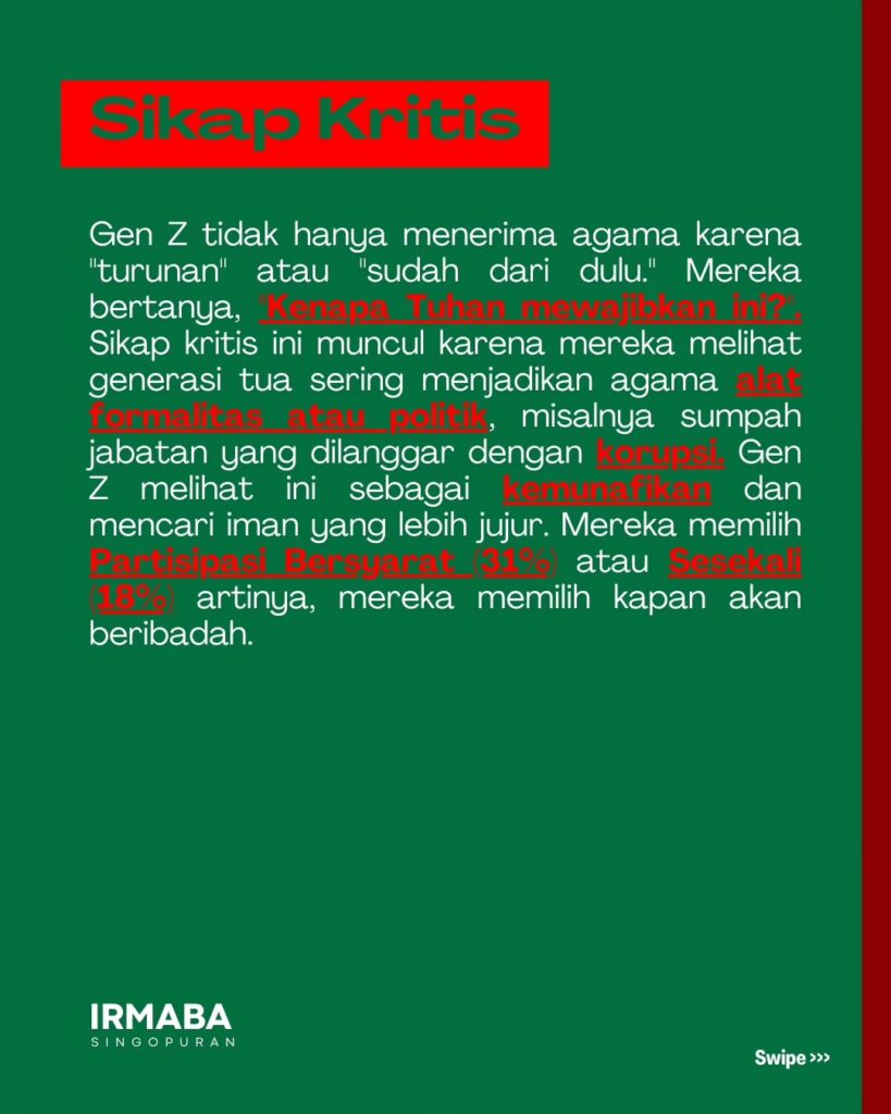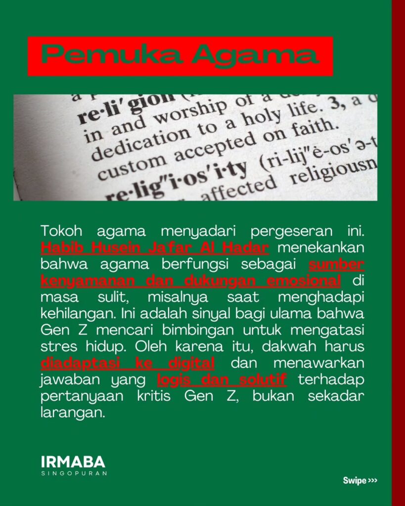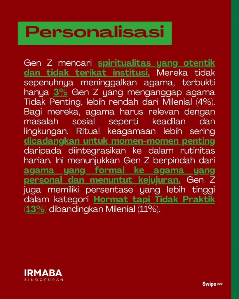 ● Gen Z menuntut keotentikan dalam beragama, bergeser dari ritual rutin menuju spiritualitas yang personal dan kritis.