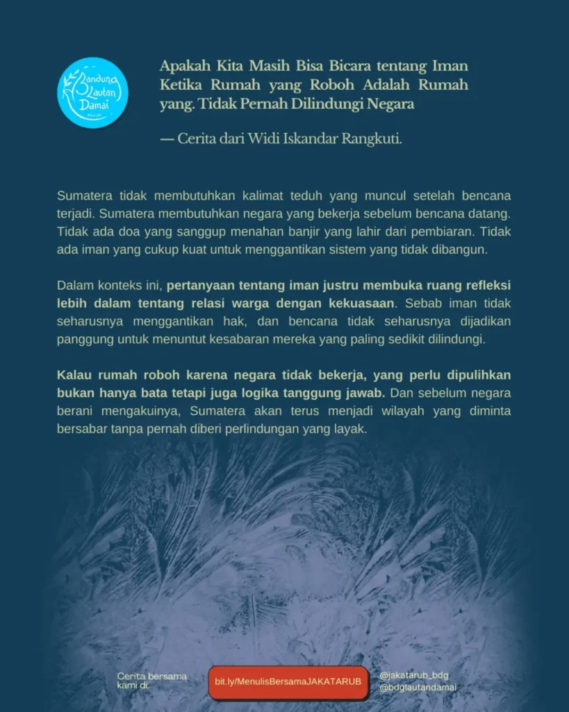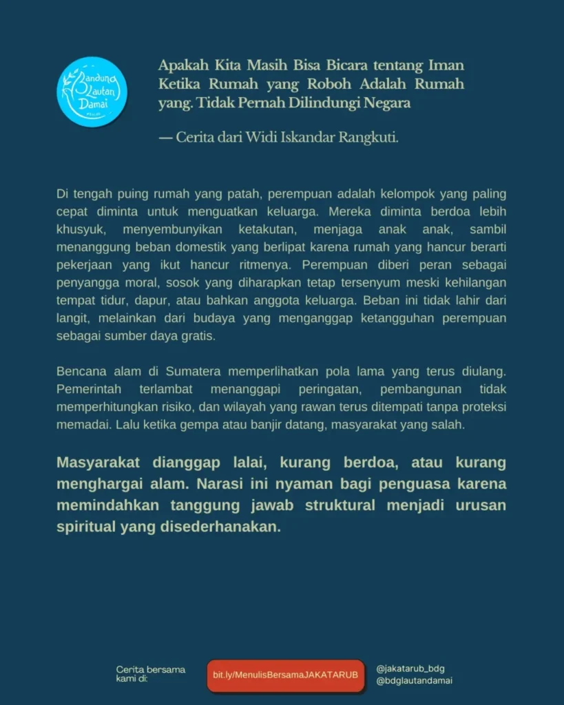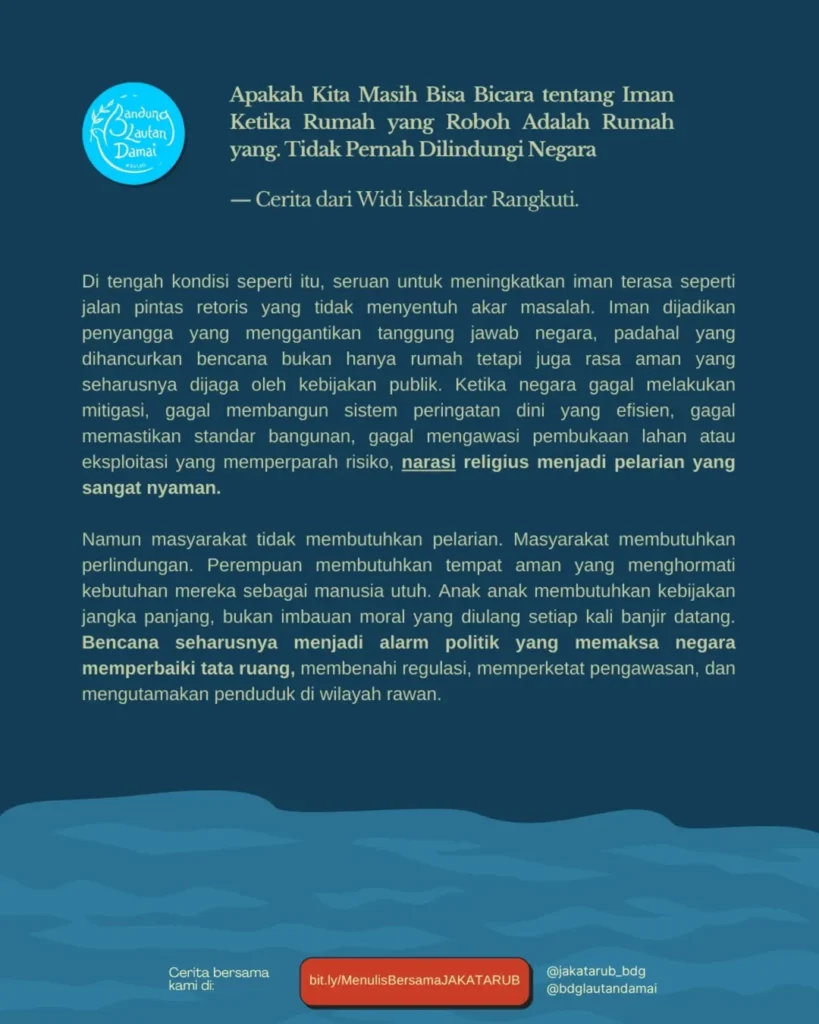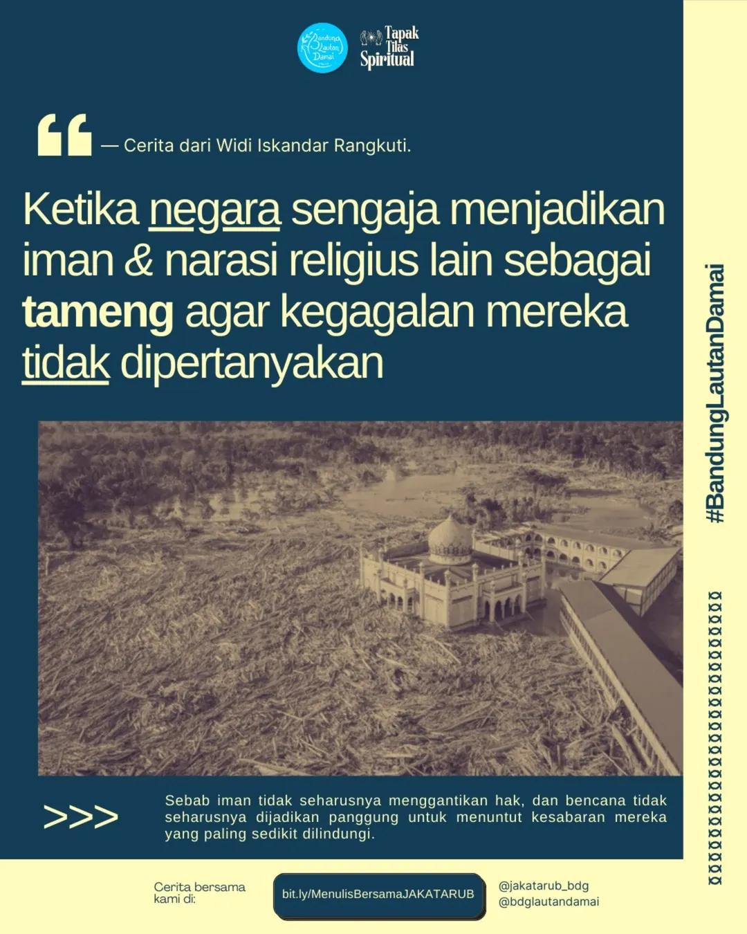β Narasi keimanan disalahgunakan negara untuk mengalihkan tanggung jawab atas kegagalan sistemik dalam mitigasi bencana.