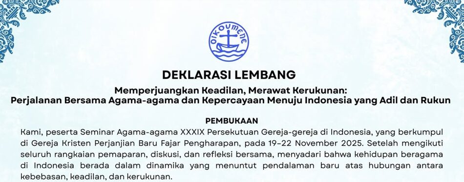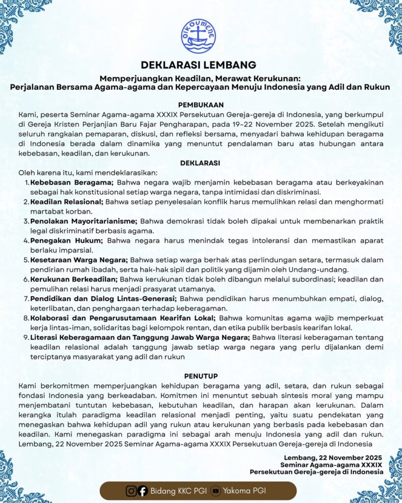 Lebih dari 140 peserta lintas agama dan kepercayaan dari seluruh Indonesia menyatakan komitmen kolektif untuk memperjuangkan keadilan dan merawat kerukunan melalui Deklarasi Lembang, yang disepakati dalam rangkaian Seminar Agama-Agama XXXIX Persekutuan Gereja-Gereja di Indonesia (PGI) di Lembang, Jawa Barat.