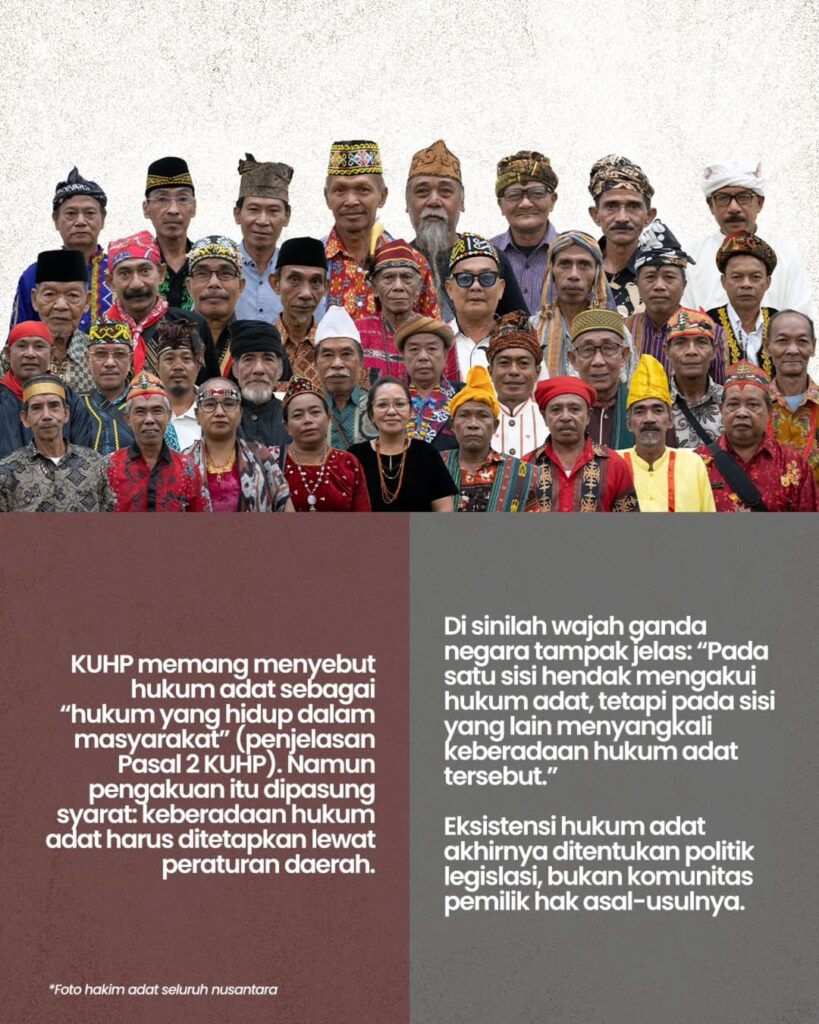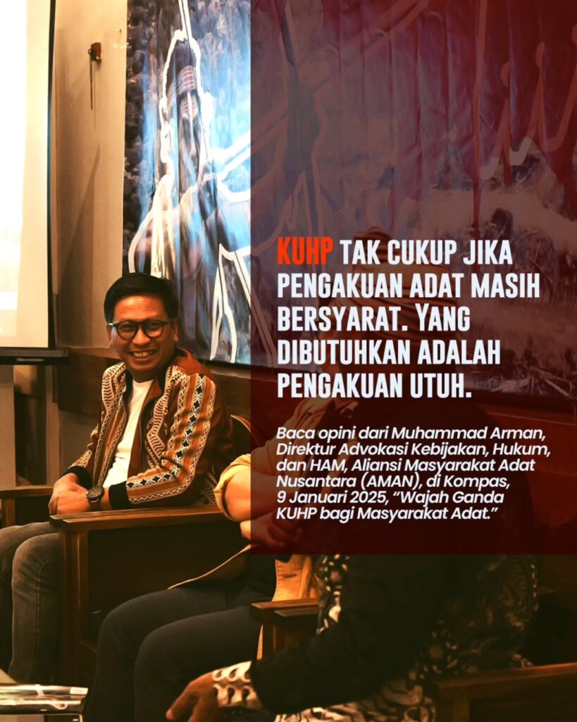 Di atas kertas, hukum adat diakui. Dalam praktik, ia dipasung syarat. Baca opini Muhammad Arman di Kompas (9/1) tentang wajah ganda KUHP dan mengapa UU Masyarakat Adat mendesak disahkan. ⚖️