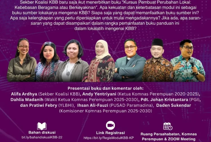 Sekber Koalisi Advokasi KBB mengundang kawan-kawan hadir dalam Diskusi & Peluncuran Buku: Kursus Pembuat Perubahan: Kebebasan Beragama atau Berkeyakinan 🗓 Jumat, 31 Oktober 2025⏰ Pukul 14.00–16.00 WIB🔗 Link Registrasi Zoom: bit.ly/diskusiKBB-22📄 Bahan Diskusi: bit.ly/bahandiskusiKBB-22 Sekber Koalisi KBB baru saja ikut menerbitkan buku “Kursus Pembuat Perubahan Lokal: Kebebasan Beragama atau Berkeyakinan”. Apa kekuatan dan keterbatasan modul ini sebagai buku sumber untuk ...