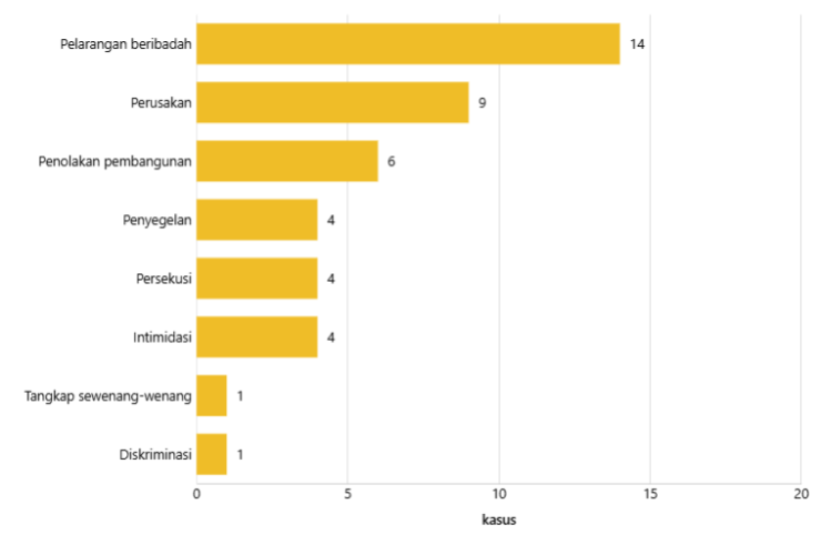 Oleh: Akbar Ridwan | Republikasi dari Databoks Jenis Tindakan terkait Pelanggaran Kebebasan Beragama dan Berkeyakinan di Indonesia (Desember 2024-November 2025) Nama Data Nilai Pelarangan beribadah 14 Perusakan 9 Penolakan pembangunan 6 Penyegelan 4 Persekusi 4 Intimidasi 4 Tangkap sewenang-wenang 1 Diskriminasi 1 Menurut Komisi untuk Orang Hilang dan Korban Tindak Kekerasan (KontraS), setidaknya ada 32 peristiwa pelanggaran terhadap kebebasan beragama dan berkeyakinan ...