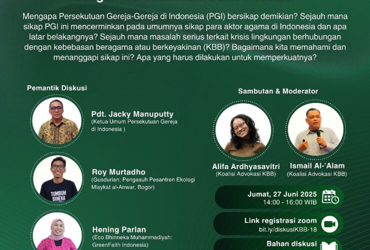 Sekber Koalisi Advokasi KBB mengundang kawan-kawan hadir dalam diskusi virtual bulanan: Aktor-aktor Agama dan Krisis Lingkungan di Indonesia: Menanggapi Pernyataan Sikap PGI, “Jangan Merusak Alam Demi Investasi” 🗓 Jumat, 27 Juni 2025, Pukul 14.00–16.00 WIB. Link Registrasi Zoom: bit.ly/diskusiKBB-18 Narasumber: Pdt. Jacky Manuputty (Ketua Umum PGI); Roy Murtadho (Gusdurian; Pengasuh Pesantren Ekologi Misykat al-Anwar, Bogor); Hening Parlan (Eco Bhinneka Muhammadiyah; ...