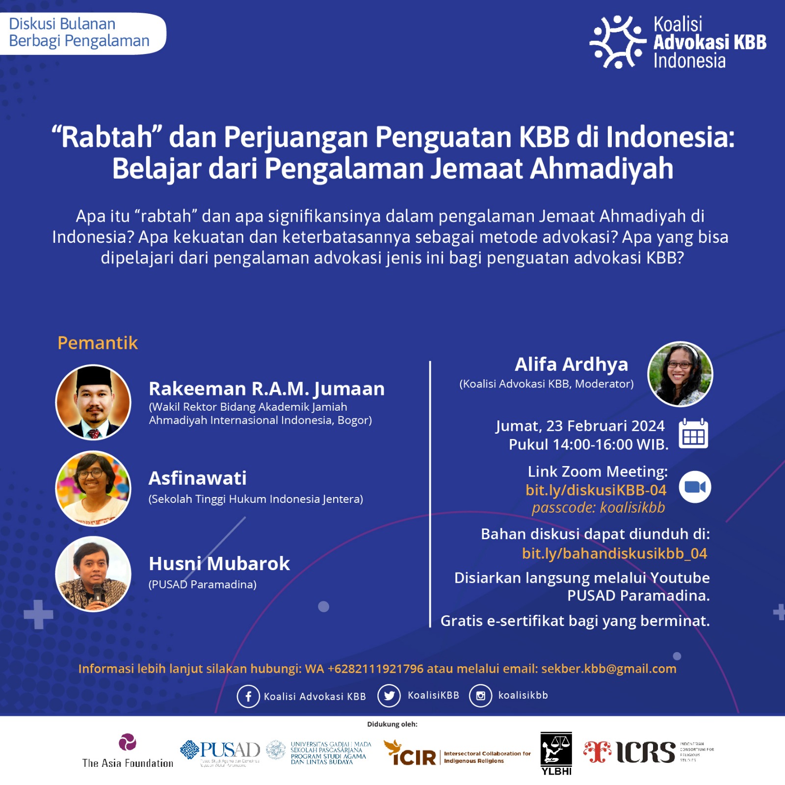 Sekber Koalisi Advokasi KBB mengundang kawan-kawan hadir dalam diskusi virtual bulanan: ‘Rabtah’ dan Perjuangan KBB di Indonesia: Belajar dari Pengalaman Jemaat Ahmadiyah Jumat, 23 Februari 2024, Pukul 14.00-16.00 WIB. Apa itu “rabtah” dan apa signifikansinya dalam pengalaman Jemaat Ahmadiyah di Indonesia? Apa kekuatan dan keterbatasannya sebagai metode advokasi? Apa yang bisa dipelajari dari pengalaman advokasi jenis ini bagi penguatan advokasi ...