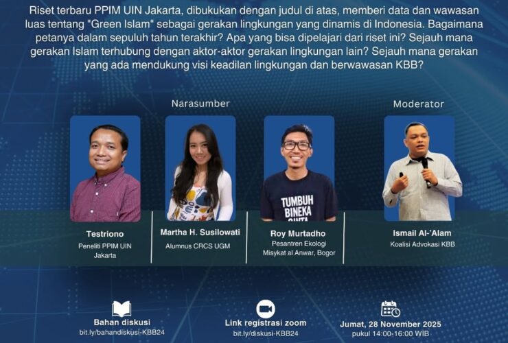 Sekber Koalisi Advokasi KBB mengundang kawan-kawan hadir dalam Diskusi Virtual Bulanan Gerakan Green Islam di Indonesia: Aktor, Strategi, dan Jaringan 🗓 Jumat, 28 November 2025⏰ Pukul 14.00–16.00 WIB🔗 Link Registrasi Zoom: bit.ly/diskusi-KBB24📄 Bahan Diskusi: bit.ly/bahandiskusi-KBB24 Riset terbaru PPIM UIN Jakarta, dibukukan dengan judul di atas, memberi data dan wawasan luas tentang “Green Islam” sebagai gerakan lingkungan yang dinamis di Indonesia. ...